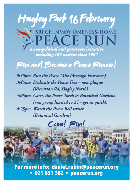 View Event code of conductCome and join us for a Peace Run through Hagley Park. All welcome.